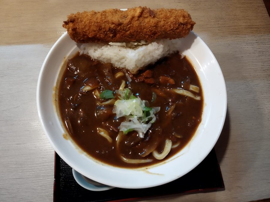 黒部ダムカレーうどんには「ドン!」とビタミンちくわのフライがのっている一品。